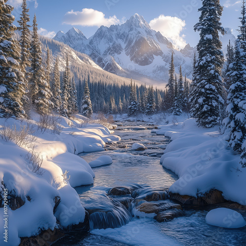 © Gin, Fototapeta premium A snow-covered mountain landscape in winter, morning sunlight shining through the mist, lush green trees and a beautiful glacier stream, creating a serene and stunning atmosphere