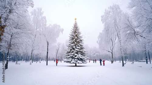 Fototapeta premium A snow-covered park with a large Christmas tree at the center, surrounded by...