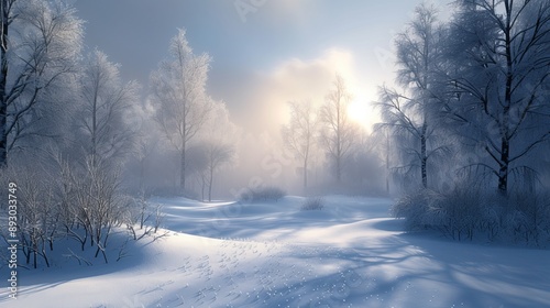 © Zeynep, Naklejka premium A Snow Covered Path in a Forest With Trees and Bushes on Both Sides of the Path - Generative AI