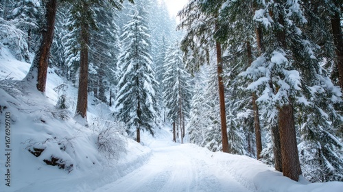 Naklejka premium A snow-covered path winds through a dense, coniferous forest on a winter day....