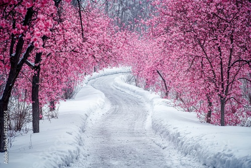 Obraz premium A snow-covered path winds through trees adorned with pink blossoms, creating...