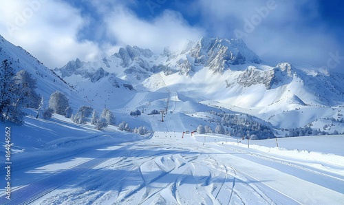 © Lucianastudio, Fototapeta premium A snow-covered ski slope with a mountain backdrop