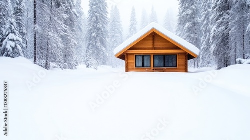 Naklejka premium A snow-covered, wooden cabin sits in a snowy forest. The cabin is small, with a gabled roof and large windows. Its set against a backdrop of snow-laden evergreen trees. The image is high-quality, wi