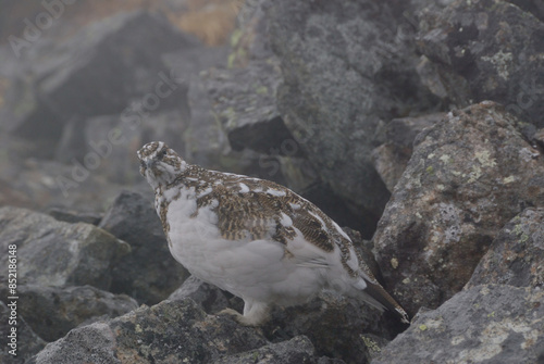 Fototapeta premium A snow grouse (a rock ptarmigan, female) / ライチョウ,夏毛から冬毛へ(初夏の北アルプス・槍穂高連峰~表銀座縦走路)