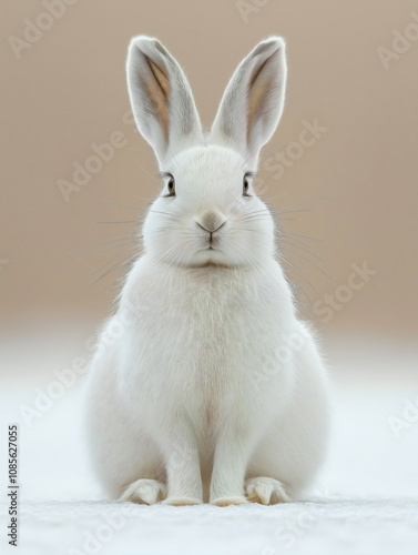 Fototapeta premium a snow hare with fluffy white winter fur, isolated on a solid light beige background