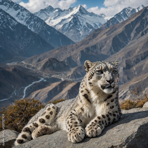 © Muhammad, Obraz premium A snow leopard resting on a rocky cliff, overlooking a stunning Himalayan landscape.