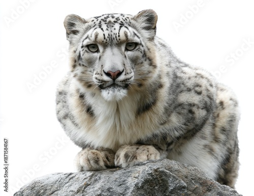 © musthofa, Fototapeta premium A snow leopard rests on a rock, its fur patterned, gazing forward. Bright, clean background