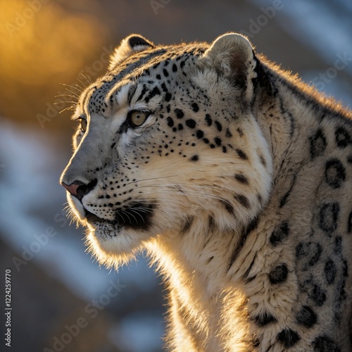 Obraz premium A snow leopard silhouetted against the golden light of the setting sun on a...