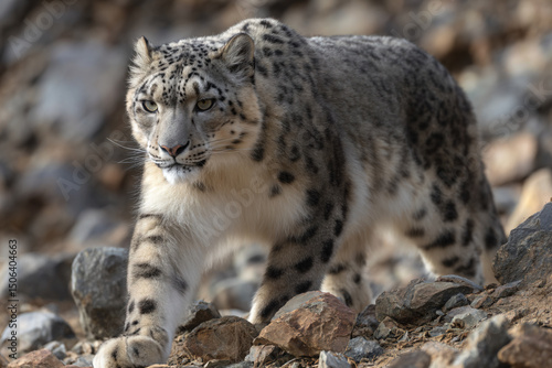 © mizmizstk, Fototapeta premium a snow leopard walking on a rocky ground