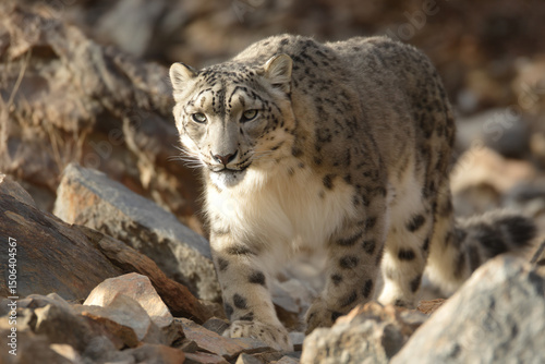 Naklejka premium a snow leopard walking on rocks in the wilderness