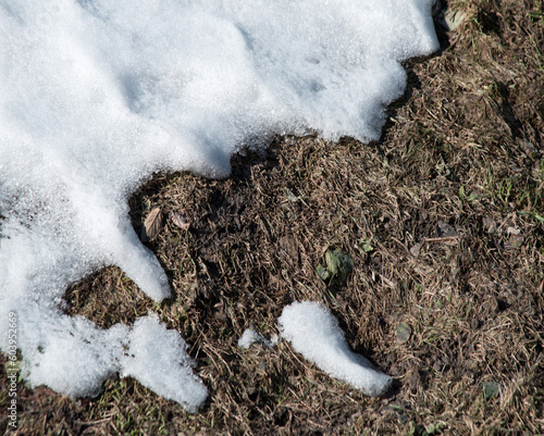 © Marina, Obraz premium A snowdrift melts on a spring lawn