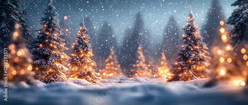 Naklejka premium A snowy Christmas landscape with snow-covered pine trees and twinkling...