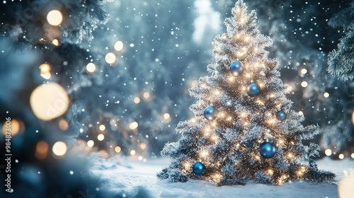 Naklejka premium A snowy Christmas tree decorated with silver tinsel, blue baubles, and glowing fairy lights, creating a magical scene.