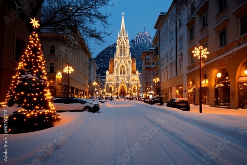 © Sanchai, Fototapeta premium A snowy cityscape postcard of a famous European cathedral, lit up for Christmas with festive decorations and snow gently falling
