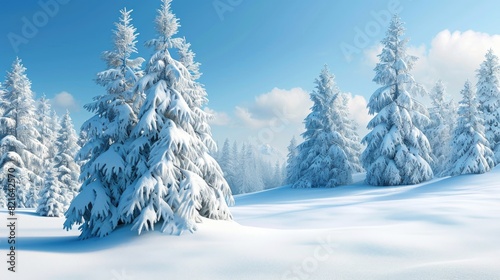 Fototapeta premium A snowy field with a few trees in the background. The trees are covered in snow and the sky is clear. The scene is peaceful and serene, with the snow covering the ground