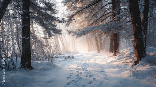 Fototapeta premium A snowy forest path with soft footprints leads into a glowing foggy winter...