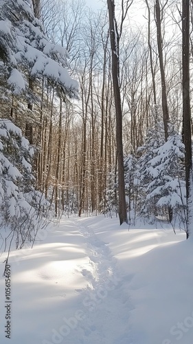 © SUNSU, Fototapeta premium A snowy forest path with trees in the background