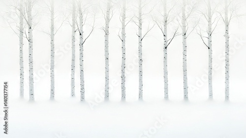 © Alice, Fototapeta premium A snowy forest scene featuring a lone tree without leaves amidst a cluster of trees blanketed in white snow