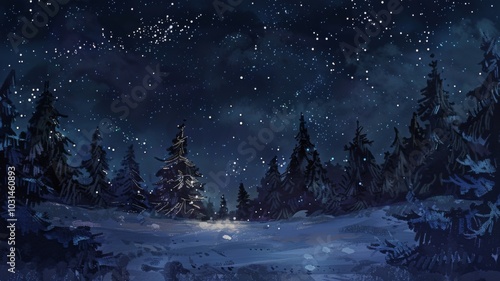 © KidsStation, Fototapeta premium A Snowy Forest Under a Starry Night Sky