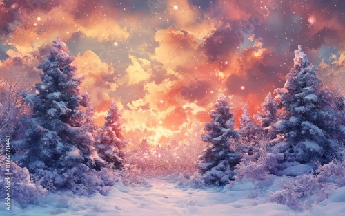 © Chaos, Fototapeta premium A snowy forest with a bright orange sky in the background