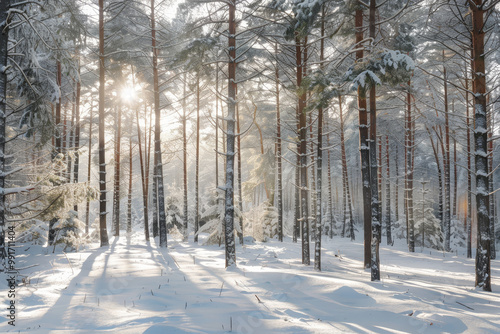 © Formoney, Fototapeta premium A snowy forest with trees and a sun shining through the trees