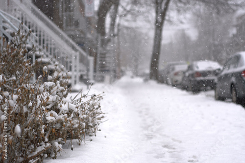 Naklejka premium A snowy garden beside a snowy sidewalk