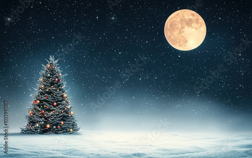 © BYAI, Obraz premium A snowy landscape adorned with a decorated Christmas tree under a bright full moon at night