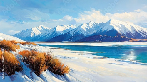 © Olga, Obraz premium A snowy landscape painting with a distant mountain range and a foreground body of water