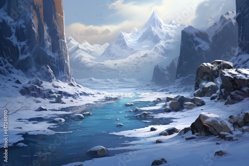 Fototapeta premium A snowy landscape with a river in the middle