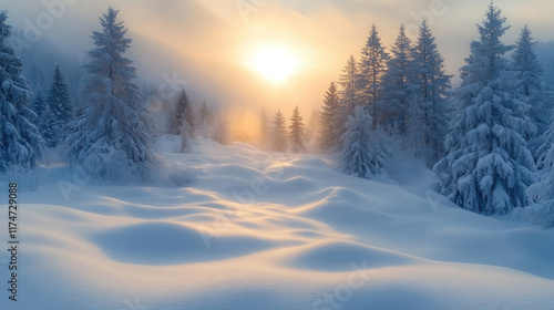 Naklejka premium A snowy landscape with gentle snowfall and frost-covered trees under soft...