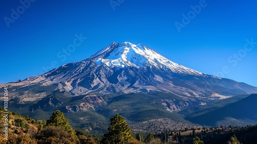 © night, Fototapeta premium A snowy mountain peak with a bright blue sky and white clouds.