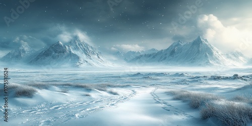 © Mufarokah, Fototapeta premium A snowy mountain range with footprints leading into the distance, under a blue sky with clouds and a few stars.