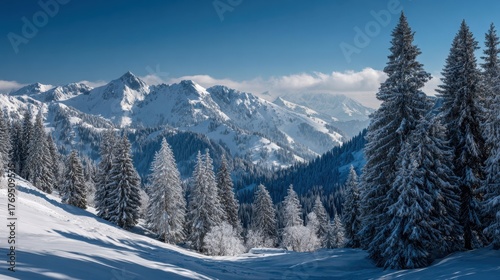 © Formoney, Fototapeta premium A snowy mountain range with trees in the foreground. The sky is blue and clear. The scene is peaceful and serene