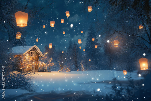 Fototapeta premium A snowy New Year's Eve landscape with glowing lanterns floating into the...