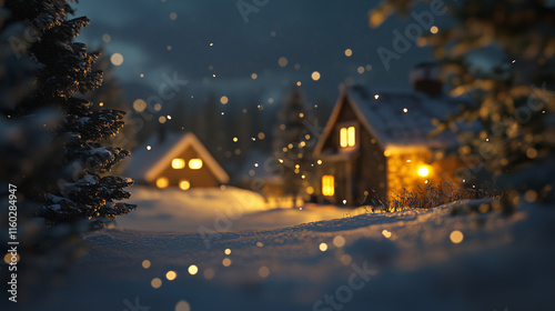 Naklejka premium A snowy night scene with houses and. Christmas, winter, village, houses trees, light, night, new,. New trees lit up the night. Christmas lights in the village at night with trees lifestyle in winter.