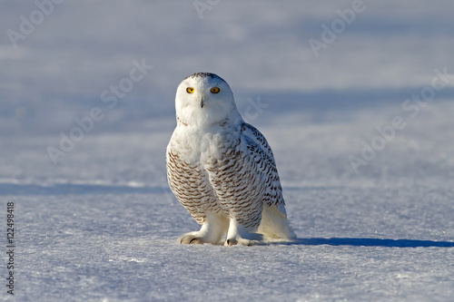Obraz premium A Snowy owl (Bubo scandiacus) casts a long shadow on a snowy field in Canada