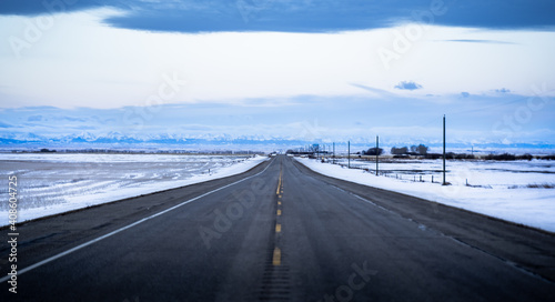 © Ramon Cliff, Fototapeta premium A snowy owl sits perched on top of a power pole along a hi way facing the distant West slopes of the Canadian Rocky Mountains.