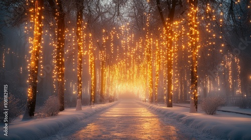 © Zaenal, Naklejka premium A snowy path lined with trees decorated with warm string lights.