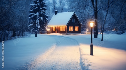 © Chuemon, Naklejka premium A snowy pathway leading to a decorated house with warm lights, creating a serene backdrop