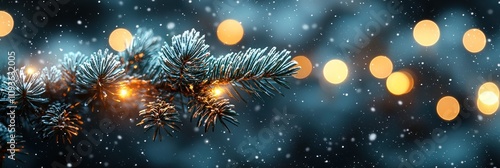 © upnowgraphics, Naklejka premium A Snowy Pine Branch with Golden Lights in the Night Sky
