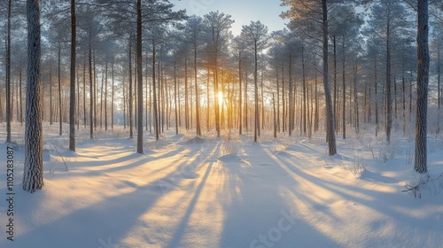 © Woranittha, Naklejka premium A snowy pine forest at dusk, with shadows stretching long