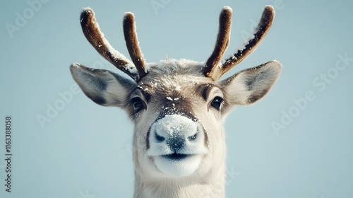 © rehan, Naklejka premium A snowy reindeer portrait against a pale blue sky