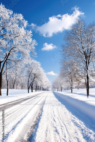 © cff999, Fototapeta premium a snowy road with trees and snow on it