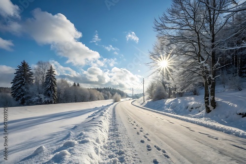 © Reshmaakter, Fototapeta premium A snowy winter road winds through a cold mountain landscape with frozen trees under a white sky