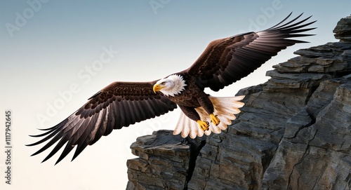 Naklejka premium A soaring eagle with wings spread wide over a rocky cliff