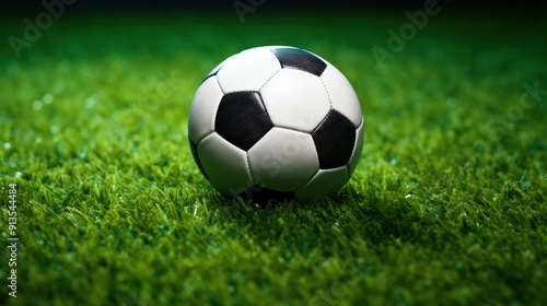 Obraz premium A soccer ball laying on artificial grass, viewed from the top,