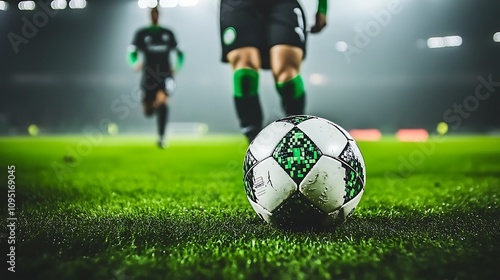© Santri, Fototapeta premium A Soccer Ball on the Field with Blurry Players in the Background