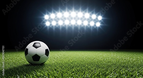 © Graphic world , Obraz premium A soccer ball sits on a vibrant green field under stadium lights.
