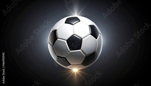 © Nangkir, Fototapeta premium A soccer ball, with black and white panels, floats against a dark, dramatic backdrop, highlighted by illuminating light rays.