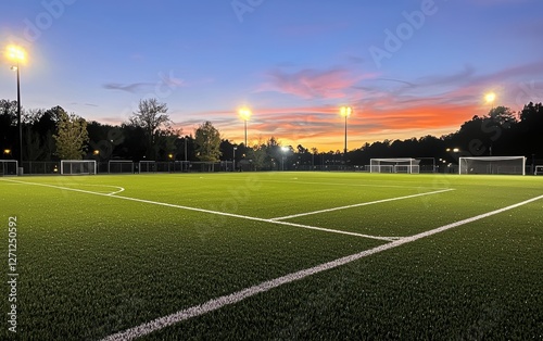 Fototapeta premium A soccer field with bright green grass and freshly painted lines